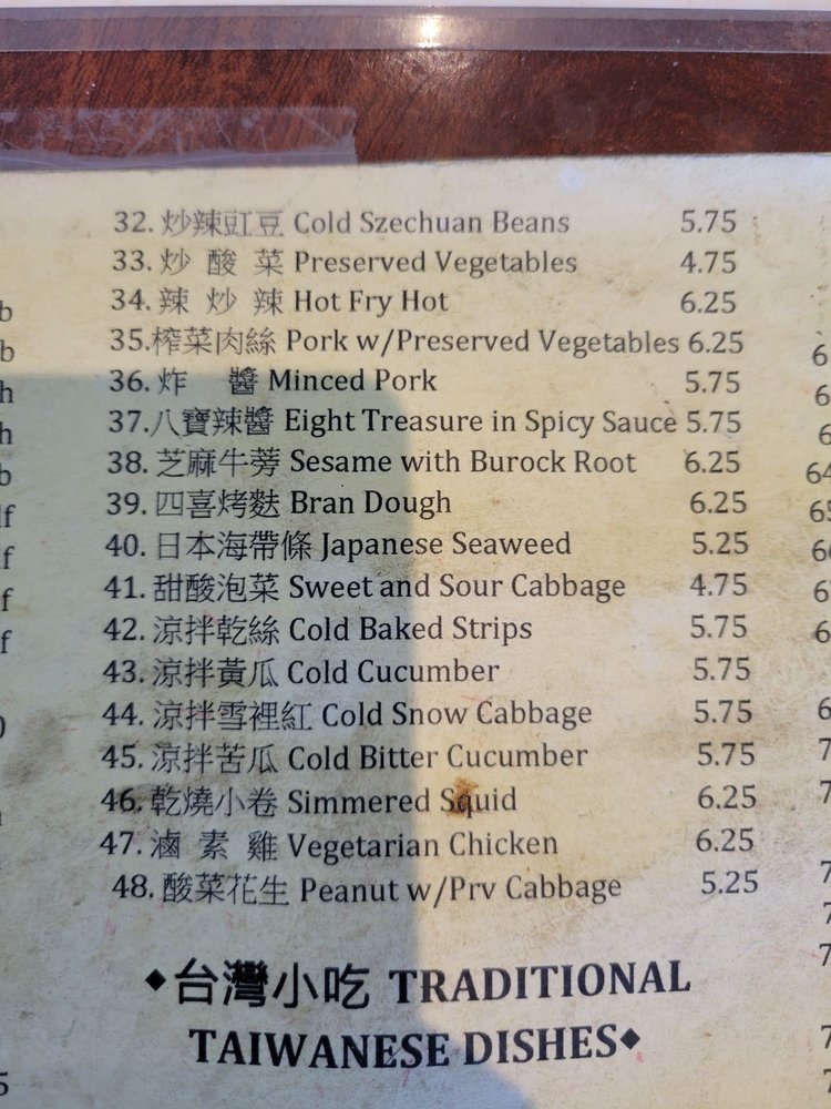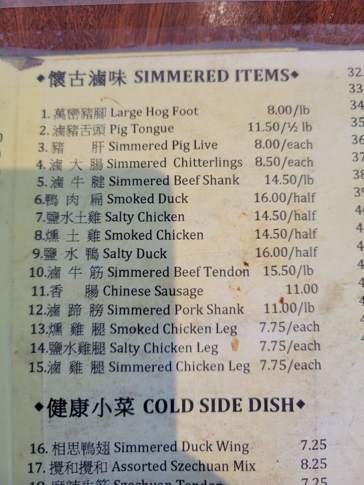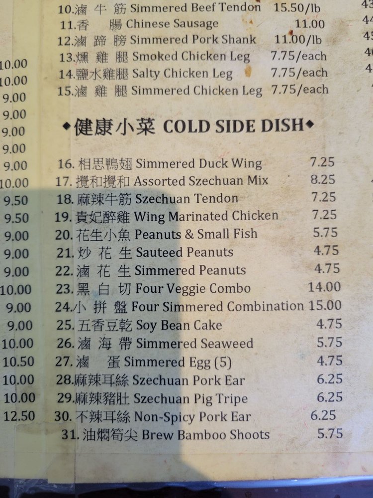 Start your meal with the Simmered Duck Wings or indulge in the Assorted Szechuan Mix, expertly paired with their signature side dishes like the Szechuan Pork Ear and Simmered Peanuts. Soups are a highlight, with options such as the rich Pork and Fish Ball Soup and comforting Hot and Sour Soup. Don't miss their frozen food section, featuring delicious Taiwanese Sausage and Braised Meatballs.